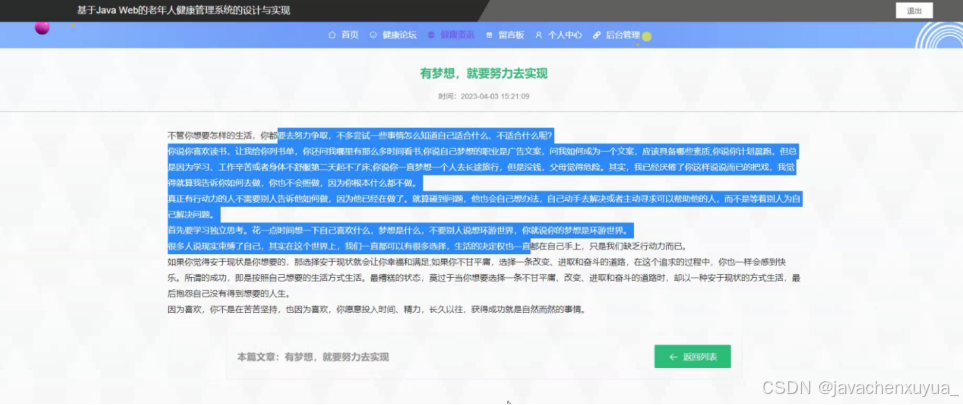 用户点击健康资讯,在健康资讯页面的搜索栏输入标题等信息,进行查询,还可以查看标题、内容、发布时间等信息,如图5-4所示: