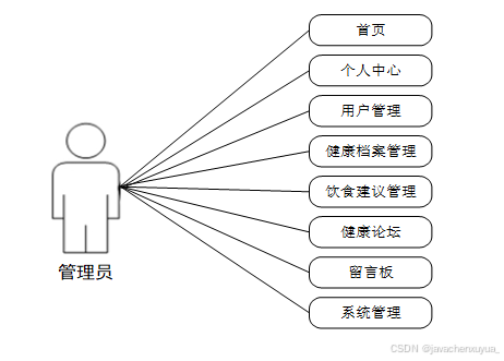管理员:负责系统维护与管理,功能包括个人中心、用户管理、健康档案管理、饮食建议管理、健康论坛、留言板和系统管理。管理员用例图如图2-2所示。