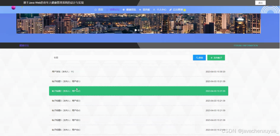 用户点击健康论坛,在健康论坛页面的搜索栏输入标题等信息,进行查询,还可以查看帖子标题、发布人、发布时间等信息,根据需要可以点击发布帖子或评论等操作;如图5-3所示: