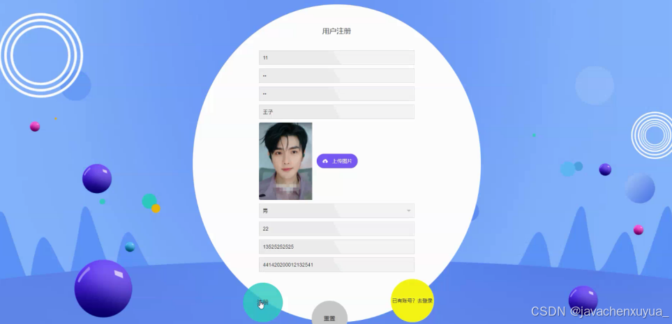 在系统首页点击注册/登录按钮,然后页面跳转到注册登录界面,后来输入用户账号、密码、确认密码、用户姓名、头像、性别、年龄、手机号码、身份证号等信息后,点击注册、登录操作,如图5-2所示: