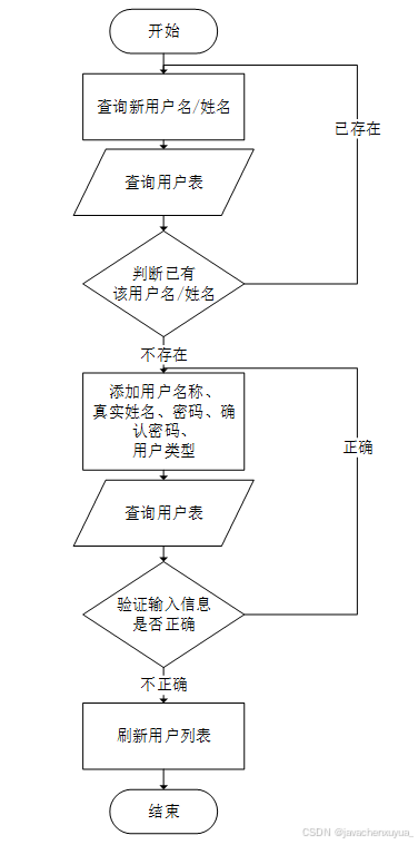 添加新用户时,系统会验证用户名是否已存在,若无重复则输入信息添加至数据库,信息完整后刷新用户列表。流程如图2-5所示。