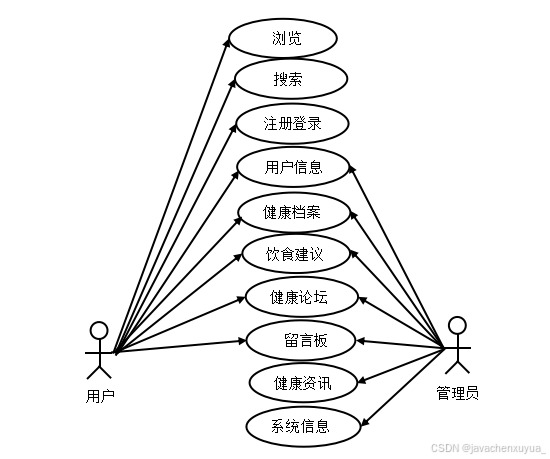 用户:主要功能包括首页、个人中心、健康档案管理和饮食建议管理。用户用例图如图2-1所示。