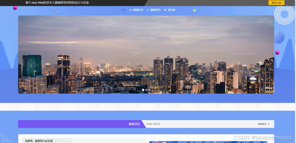 当游客打开系统的网址后,首先看到的就是首页界面。在这里,游客能够看到老年人健康管理系统的导航条显示首页、健康论坛、健康资讯、留言板等功能。如图5-1所示: