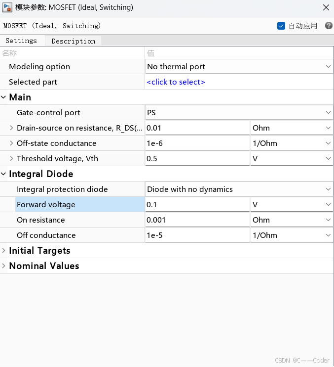 添加进来Mos管和Voltage Source(设置好电压),并按照下图设置好参数并建立好模型