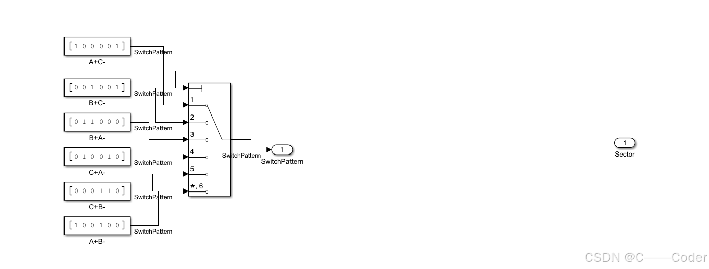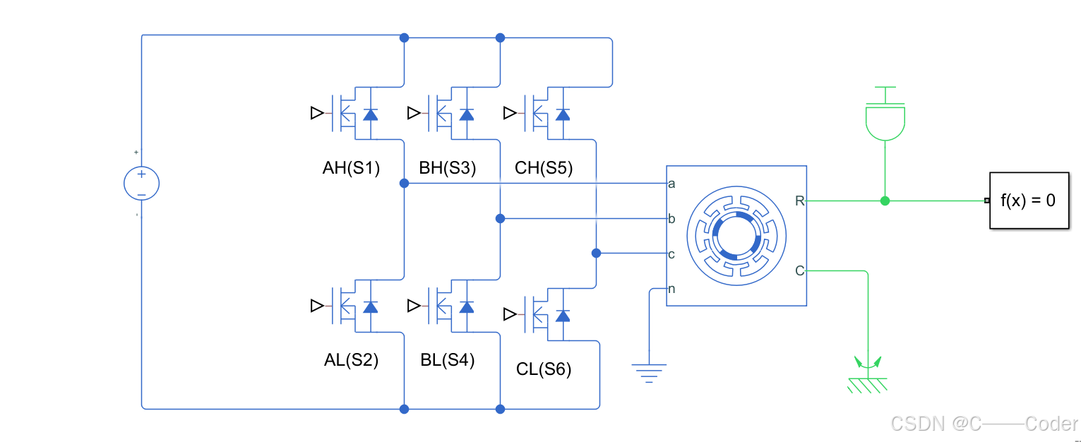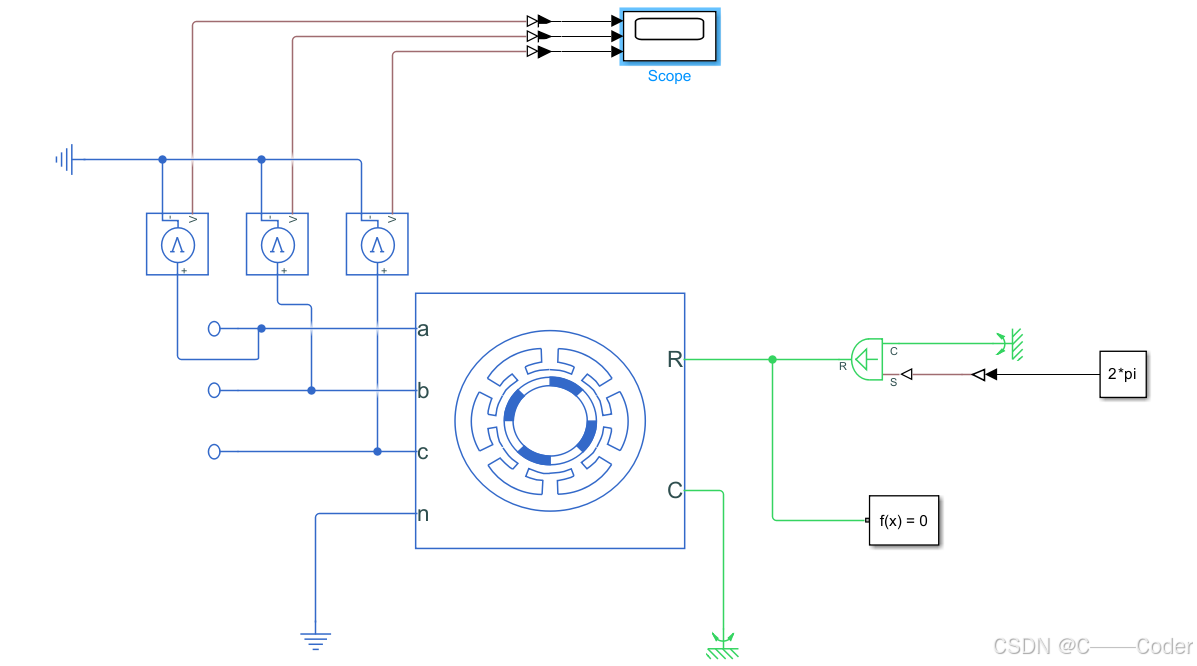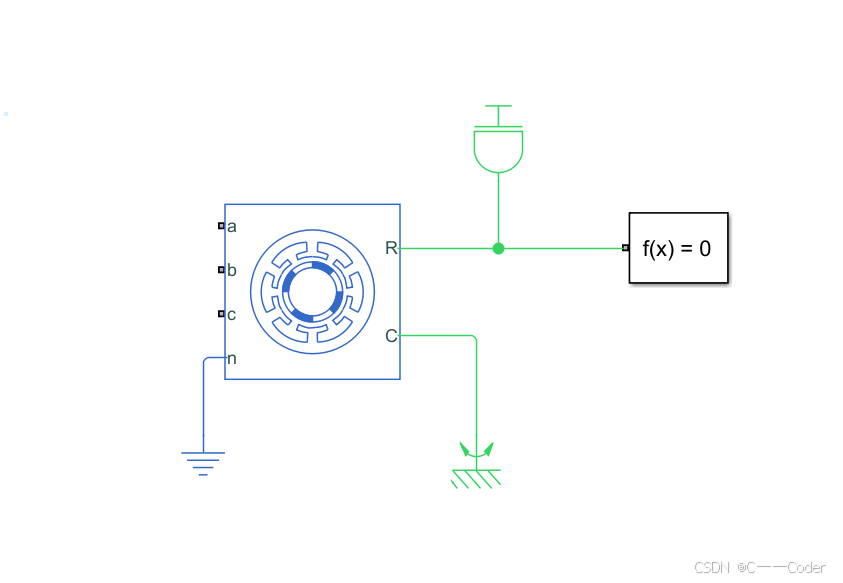 设置几个outcircuit端口作为开路,连接到BLDC模块的a、b、c三个端口,n接入Electrical Reference(电气地参考),C接入Mechanical Rotational Reference(机械旋转参考)。