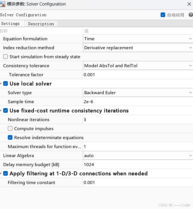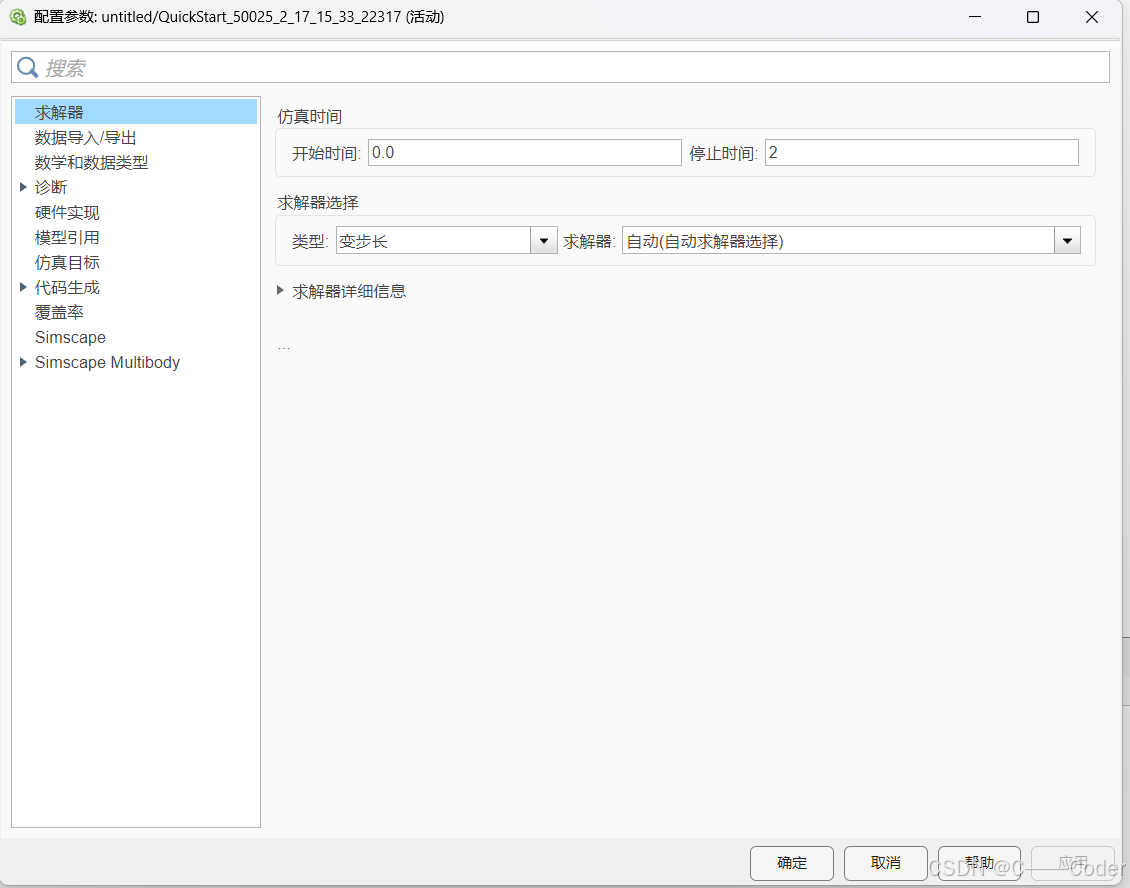 因为这个求解器的采样时间很短,推荐将simulink仿真设置为变步长。设置为定步长会提示错误