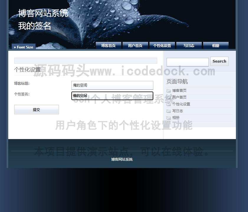 主要功能说明: 用户注册,用户登陆,个性化设置,添加文章,相册设置,博客首页等功能。