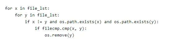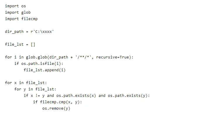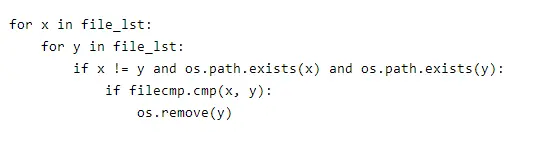 上一步我们获取了目标文件夹下的所有文件路径,接下来就可以嵌套遍历这个路径列表,其中 filecmp.cmp 进行文件判断, os.remove 进行文件删除