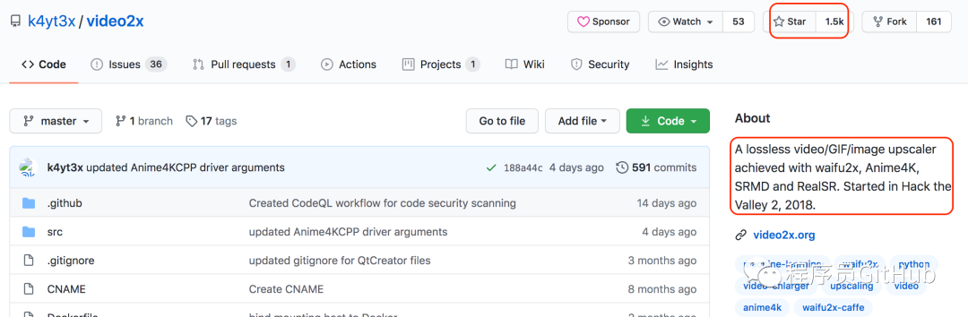 这个库叫video2x,目前收获1500颗星,是一款可以无损的放大图片,视频和 GIF功能的工具,它是基于waifu2x,Anime4K,SRMD 和RealSR开发而成的。那么到底有多牛逼呢,小编看了之后直流口水。