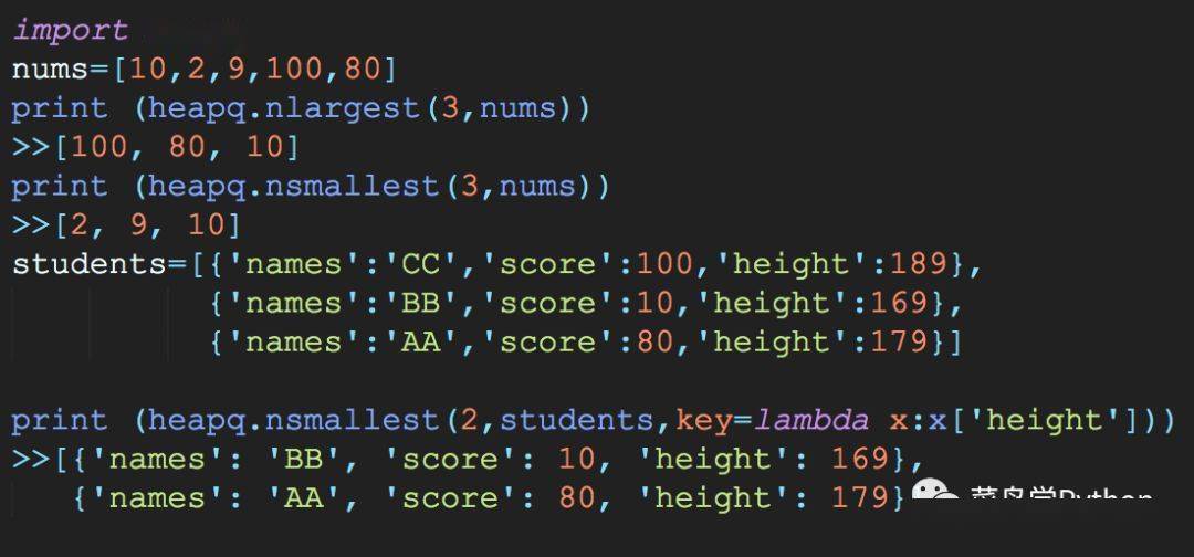 点评:这个heapq库非常好用,尤其是我们在取一些列表的头部数据,比如最大几个,最小几个经常用到,很实用的一招!啥也不说了,赶紧背下来!