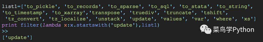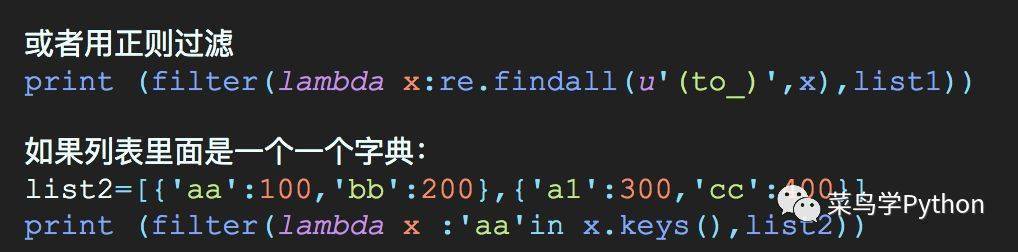点评:lambda是一个非常简洁的函数表达方式,短小精悍,加上配合filter一起使用,非常漂亮。比如我们通过 字符串里的startswith内置函数,非常方便的过滤出列表里面我们需要的数据! (Python3稍微改一下再filter之外再加一个list,不然生成的是迭代器地址)