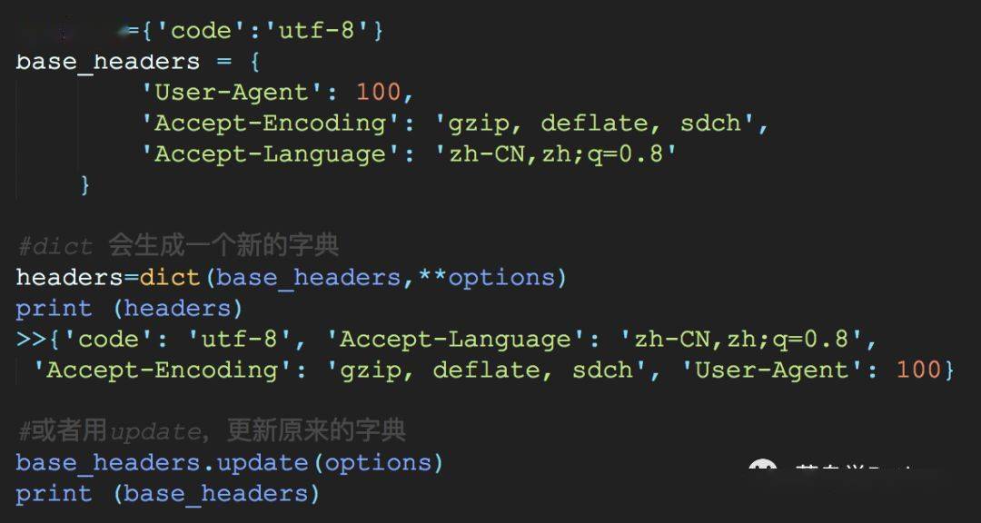 点评:dict.update还是比较平易近人的,这个dict(dict,**options)用法我第一次看到的时候也是楞了一些,什么鬼,现在见多了,也就习惯了!