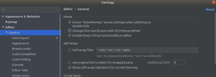这个快捷键也是可以变大变小,不过变的是字体,在此之前你需要先设置一下,打开 PyCharm 的设置面板,进入 Editor | General,把 Change font size (Zoom) with Ctrl+Mouse Wheel 给选上,然后可以到你的打代码的面板进行骚操作了。