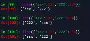 将字典转化为列表、元组、集合只会保留其键,值不会保留,如: