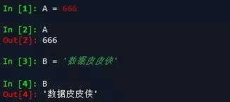 使用等号(=)来给变量赋值。等号(=)运算符左边是一个变量名,等号(=)运算符右边是存储在变量中的值。下图是将数字666、'数据皮皮侠’分别赋值给A、B变量。
