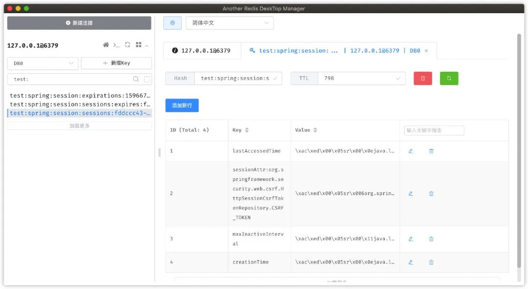当我们访问上面地址之后,访问 Redis ,可以看到存储的 Session 信息。