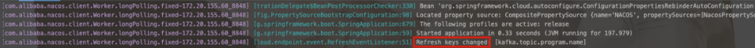 @Value()来直接读取 Nacos 配置中的属性参数,也可以使用@ConfigurationProperties(prefix = "spring.datasource")读取批量参数。spring.cloud.nacos.config.ext-config[0].refresh=true该参数表示是否开启自动更新,根据是否需要自动更新觉得是否配置,如果需要自动更新,加上这个配置后还需要在需要自动更新配置的 Bean 上面增加@RefreshScop注解。然后对应的 Bean 内部的属性就可以实现自动更新了。增加了spring.cloud.nacos.config.ext-config[0].refresh=true配置后在修改了 Nacos 中的配置过后日志会出现下面信息,会重新加载配置,并且输出变更的 key 信息。