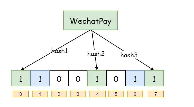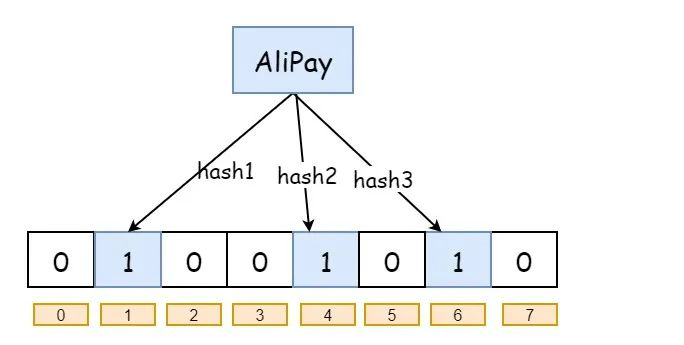 以给的为例,我们现在将 “AliPay” 这个值,通过三个不同的哈希函数进行映射,那么大概就是这样了: