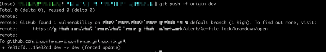 我们再通过git push -f origin branch 命令将重置的版本推送到远程服务器上,由于在推送到服务器前我们本地的代码已经落后服务器的代码了,所以我们需要增加-f 参数表示强制推送到远程服务器。
