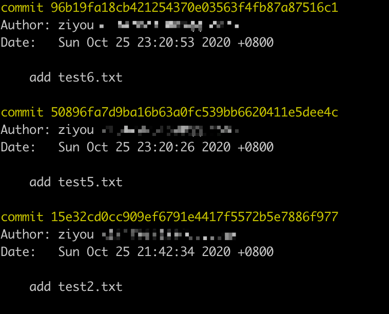 下面再看下 git revert 命令的使用方式,我们分两次创建两个文件,分别commit 和 push 到远程,然后通过 git log,我们可以看到下面内容,现在最新的版本已经是 test6.txt 了。同样的,这个时候我们发现 test5.txt 的版本有问题,但是 test6.txt 的版本是正确的,我们只想撤销掉 test5.txt 版本的提交。