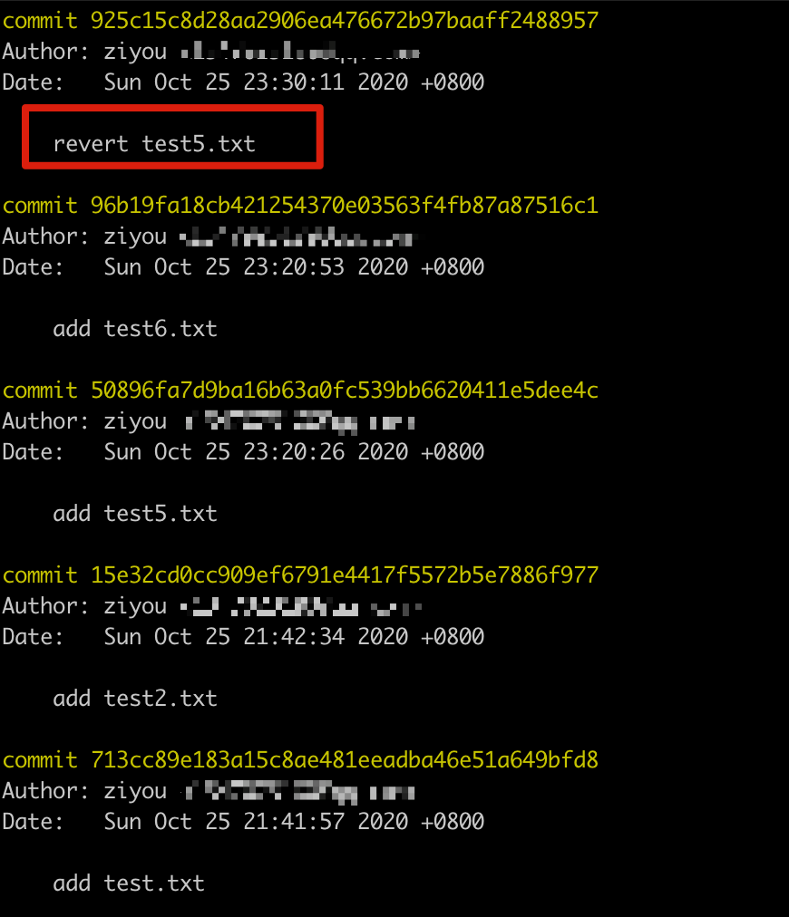 再通过git log 我们可以看到,产生了一次新的提交将我们 test5.txt 版本的内容撤销掉了,并且 test6.txt 版本的提交还依旧保留在。