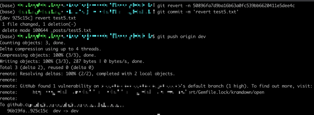 这个时候我们执行命令git revert -n 50896fa7d9ba16b63a0fc539bb6620411e5dee4c 将 test5.txt 版本给撤销,并执行git commit -m xxx 进行提交然后在push 到远程。
