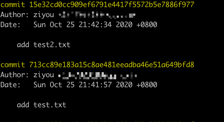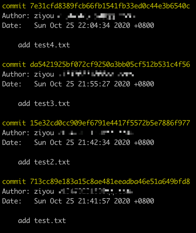 我们先分几次创建几个文件,然后依次commit 和 push ,形成多次提交,如下图所示,我们创建了四个文件,每个文件单独 commit 和 push,然后通过git log 命令我们可以查看的整个提交的日志信息,其中就包含了四次的文件提交记录。