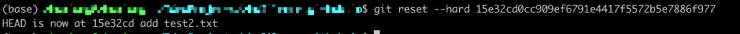 现在我们突然发现 test3.txt 文件提交的有问题,我们需要回滚到 test2.txt 的版本,我们可以通过执行命令git reset --hard 15e32cd0cc909ef6791e4417f5572b5e7886f977 --hard 表示强制回到指定的版本,后面紧跟的是目标的版本号。