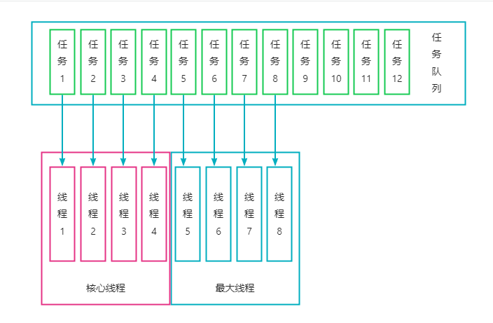 下面这张图可以看出,核心线程数量为 4,最大线程数量为 8。新任务提交到线程池时,首先判断是否有线程或者线程数量是否小于核心线程数,若满足则首先创建新的线程执行任务,当核心线程数到达 corePoolSize 时,将任务缓存到任务队列中,当任务队列存放的任务到达队列容量时,再创建新的线程,直到达到 maxnumPoolSize 的线程数量,后续再根据拒绝策略返回。
