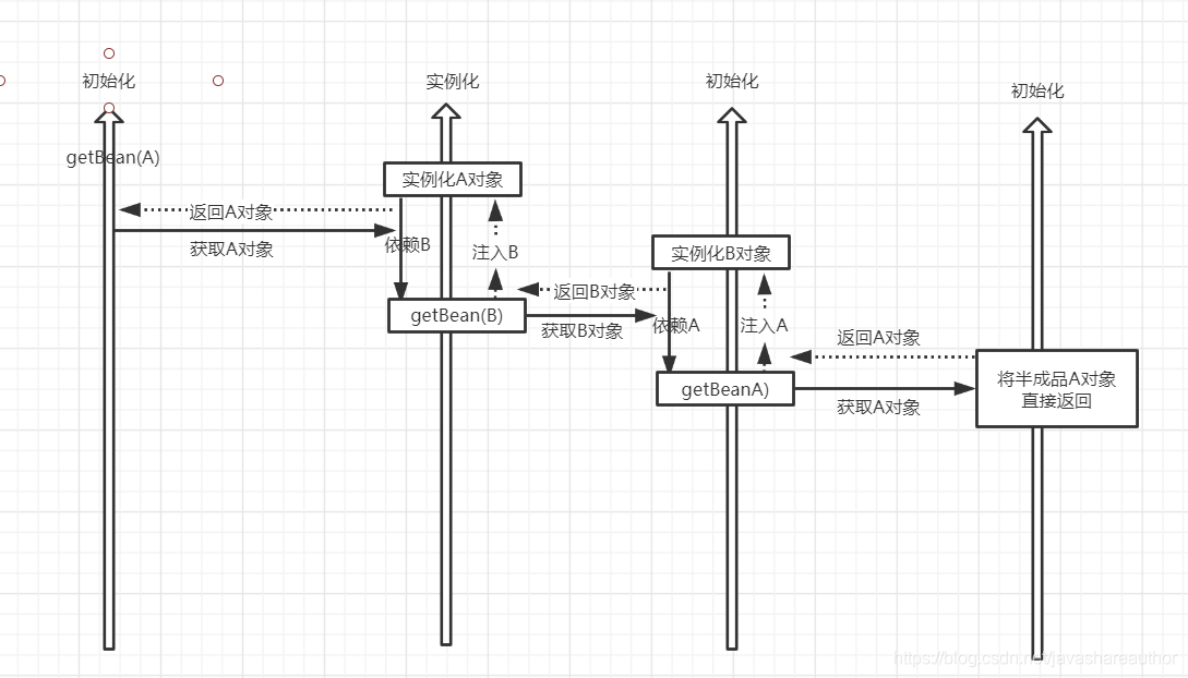 在该方法中会得到一个半成品的A对象的实例,然后将该实例返回,并且将其注入到B对象的属性a中,此时B对象实例化完成。