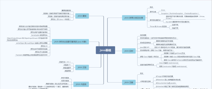 1、Java基础:JAVA 异常分类及处理、JAVA 反射、JAVA 注解、JAVA 内部类、JAVA 泛型、JAVA 序列化(创建可复用的 Java 对象)、JAVA 复制等。