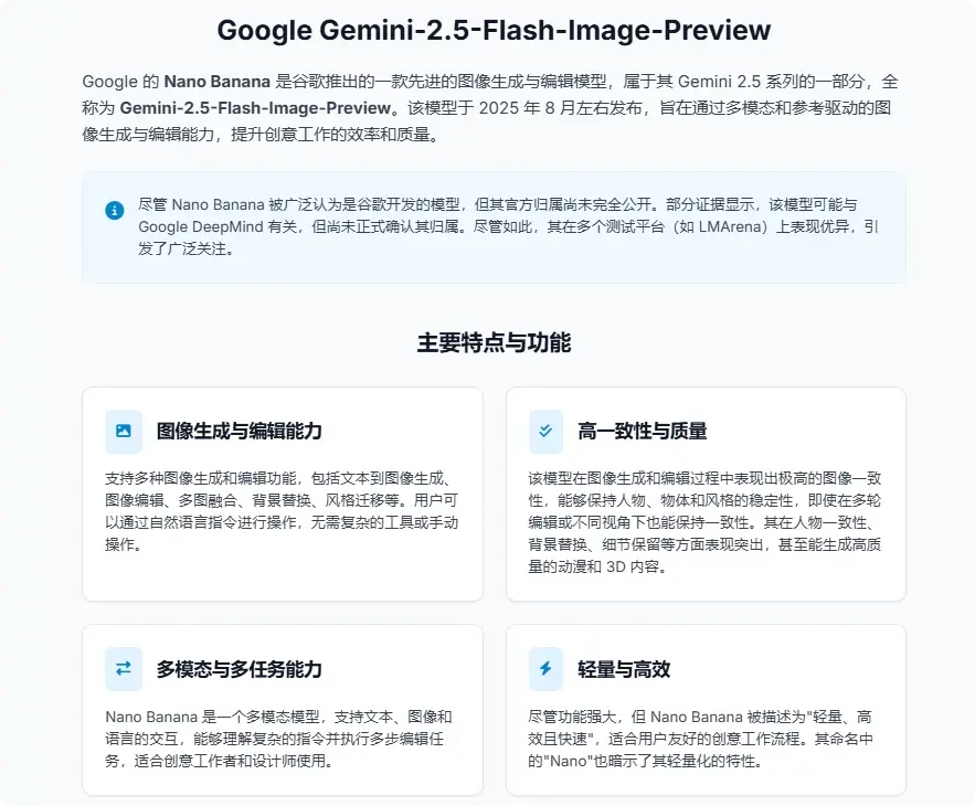 Google 的 Nano Banana 是谷歌最新推出的图像生成与编辑模型,其正式名称为 Gemini 2.5 Flash Image 。该模型是谷歌在多模态AI领域的重要进展,专注于图像生成和编辑,具备强大的图像生成、编辑和多轮交互能力 。Nano Banana 被认为是目前最优秀的AI图像工具之一,其性能强大,效果出色,尤其在图像生成、编辑、动画制作等方面表现突出。