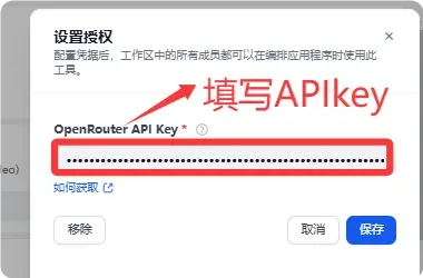 安装成功后,我们需要对这插件进行授权,我们这里使用OpenRouter API,大家可以在OpenRouter 注册一个账号生成APIkey 授权到这个插件,完成授权成功。