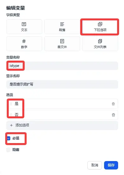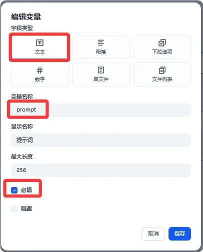 其中提示词是文本字段类型是必填项。