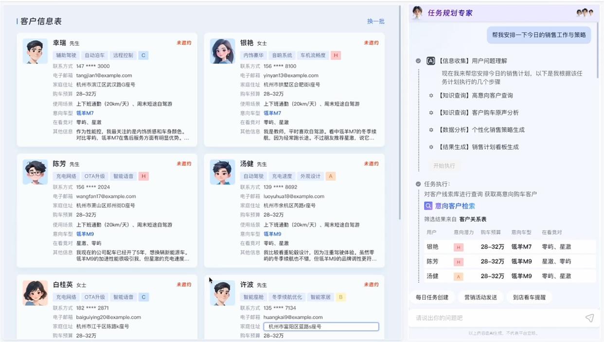销售任务规划Agent、线索清洗Agent、销售策略Agent和到店邀约Agent正是为了解决汽车销售的全流程痛点而生的,这四个Agent可以根据业务目标为销售进行初步的线索筛选,检索出销售应该优先处理跟进的线索,并且根据销售的需求,进行AI电话外呼或根据用户画像推荐销售话术,自动打给消费者邀约试驾和沟通购车意向,等消费者试驾完成后,试驾报告Agent会再进行电话回访,并且生成消费者的试驾报告,提供销售评估后续的销售策略。可缩短线索处理时间50%,基于客户深度分析提升转化率约20%。