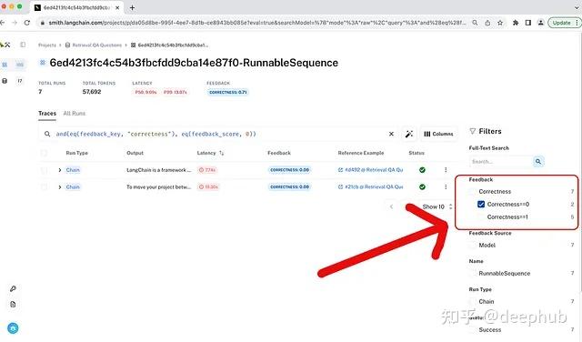 运行完成后,LangSmith 仪表板提供结果分析界面。除了聚合分数外,更重要的是可以筛选失败案例进行调试。