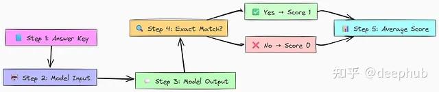 该评估流程的核心机制包括:建立标准答案作为预期响应的基准;向模型提供输入并获取基于该输入的输出;执行逐字符精确匹配检验,若匹配则赋值 1 分,不匹配则为 0 分;最后对所有样本的得分进行平均计算,得出模型的整体精确匹配性能指标。