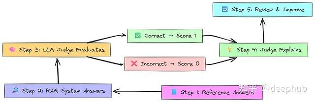 该评估流程始于创建包含问题和参考答案(黄金标准)的数据集。基于 RAG 的问答系统随后使用检索到的文档回答每个问题。独立的 LLM(充当"评判者")将预测答案与参考答案进行比较。若答案在事实上正确,评判者给予 1 分;若答案错误或存在幻觉,则给予 0 分。评判者提供推理过程来解释评分依据。最终,开发者可以审查错误案例,改进系统并重新执行评估。