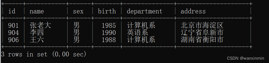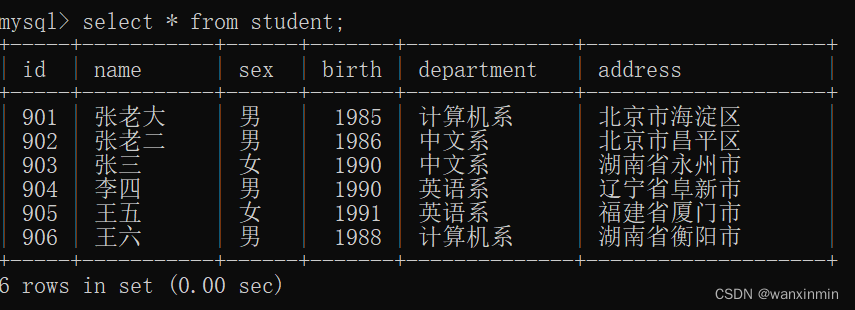 INSERT INTO student VALUES( 906,'王六', '男',1988,'计算机系', '湖南省衡阳市');