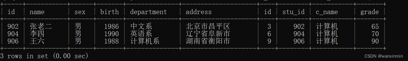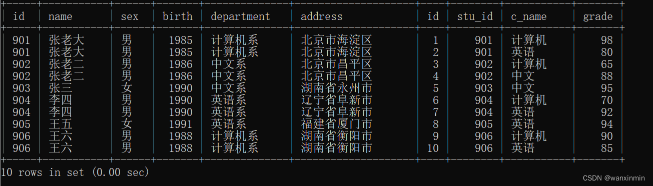 select student.name,year(now()-birth) as age,student.department,score.c_name,score.grade from student inner join score on student.id = score.stu_id where address like '湖南%';