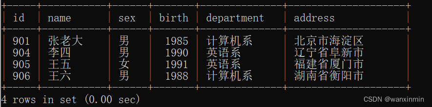 INSERT INTO student VALUES( 904,'李四', '男',1990,'英语系', '辽宁省阜新市');