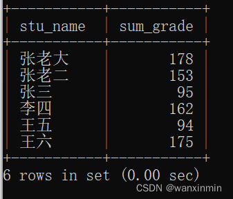 select student.name as stu_name,sum(score.grade) as sum_grade from score inner join student on score.stu_id = student.id group by student.name;