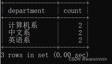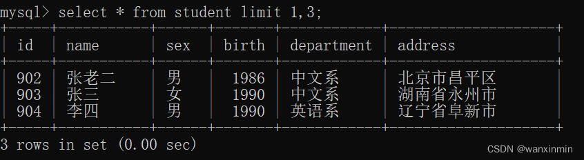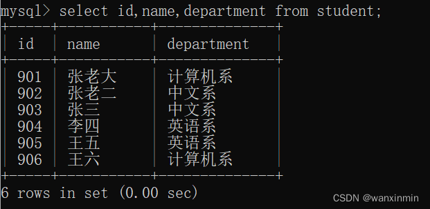 5.从student表查询所有学生的学号(id)、姓名(name)和院系(department)的信息