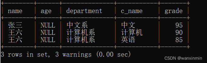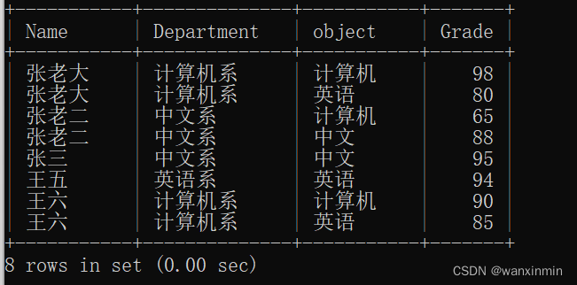 select student.name as Name,student.department as Department,score.c_name as object,score.grade as Grade from student inner join score on student.id = score.stu_id where student.name like '张%' or student.name like '王%';