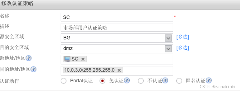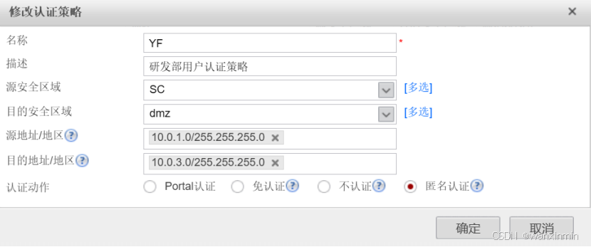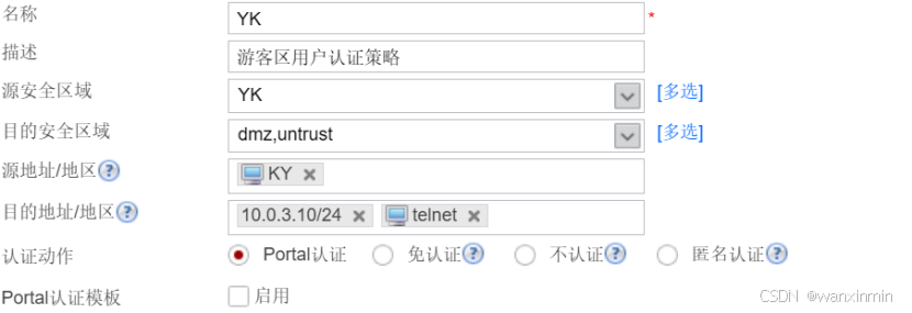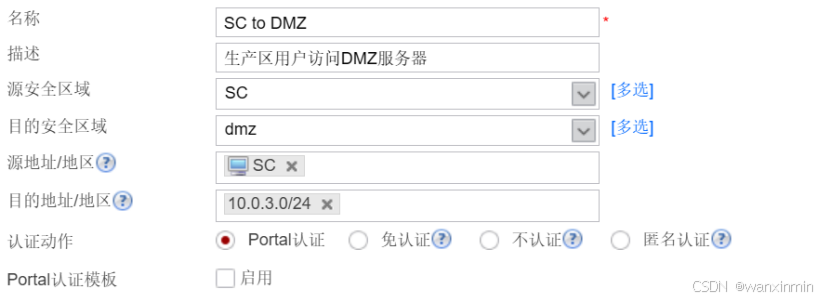 任务4:,办公区分为市场部和研发部,研发部IP地址固定,访问DMZ区使用匿名认证,市场部需要用户绑定IP地址,访问DMZ区使用免认证;游客区人员不固定,不允许访问DMZ区和生产区,统一使用Guest用户登录,密码Admin@123,游客仅有访问公司门户网站和上网的权限,门户网站地址10.0.3.10