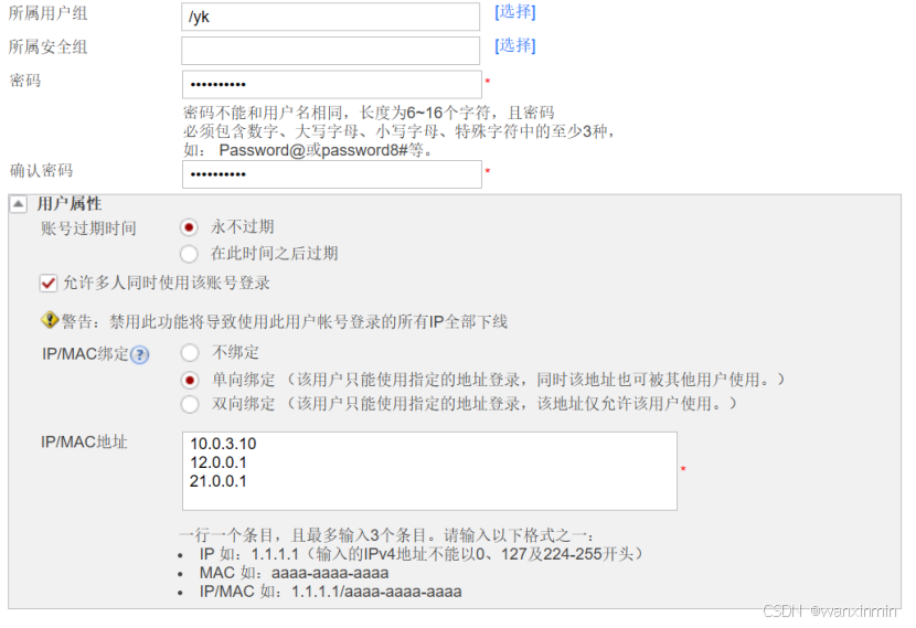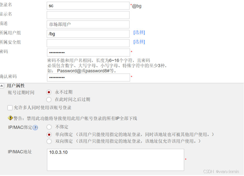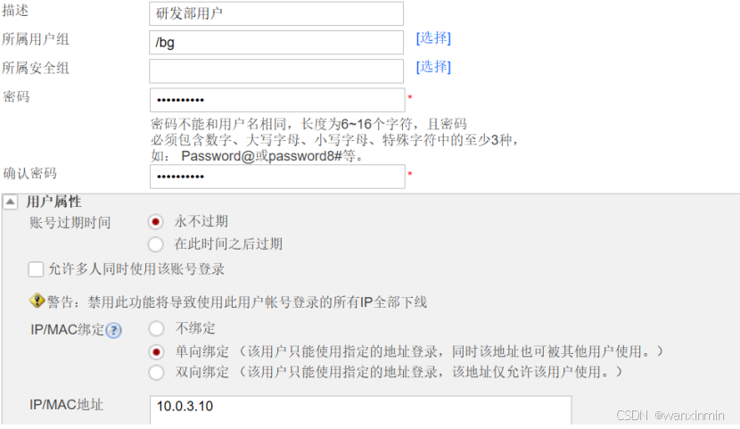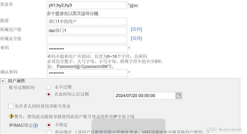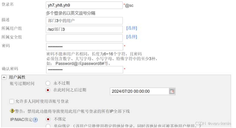 任务五:生产区访问DMZ区时,需要进行protal认证,设立生产区用户组织架构,至少包含三个部门,每个部门三个用户,用户统一密码openlab123,首次登录需要修改密码,用户过期时间设为10天,用户不允许多人使用