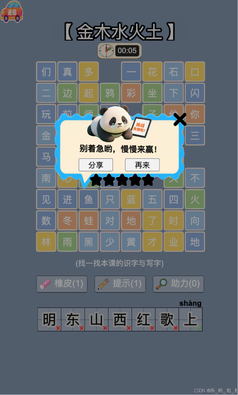 通过豆包+课文素材,经过二个多月的时间微信小游戏终于上线了。同学们可以在微信中搜索"课时大闯关",就可以找到了,快来让孩子们体验学习吧。