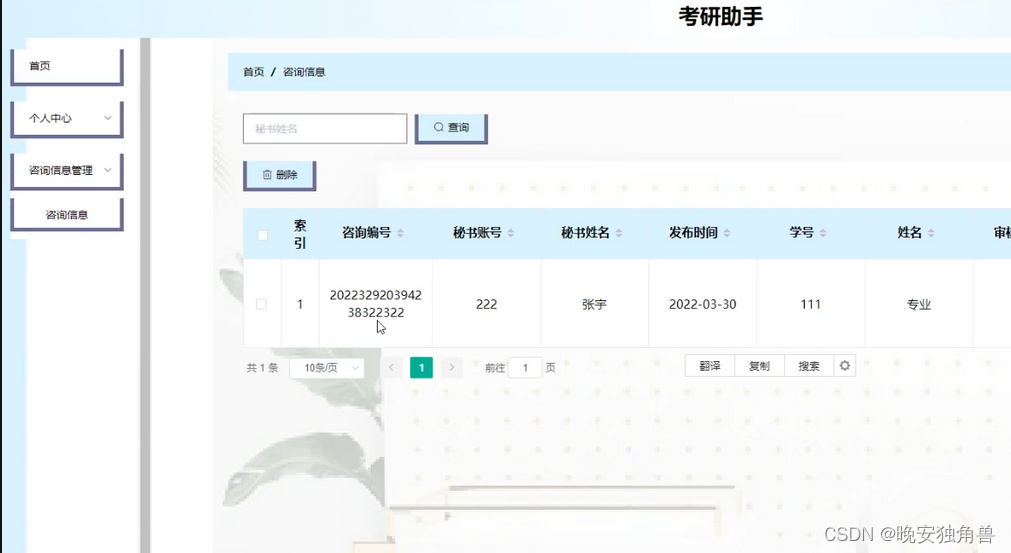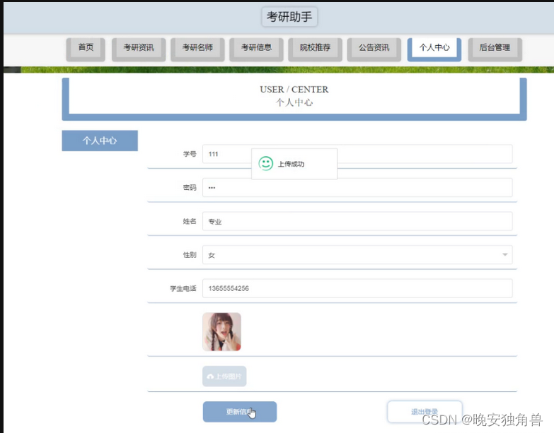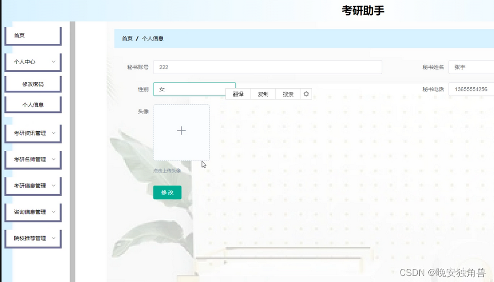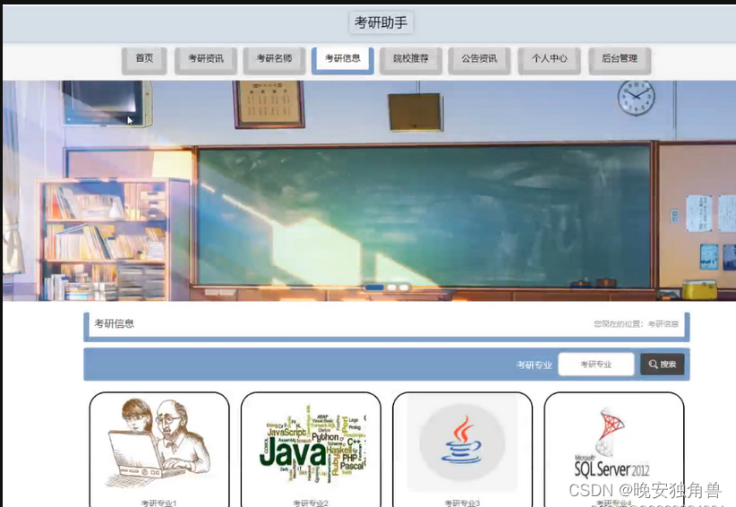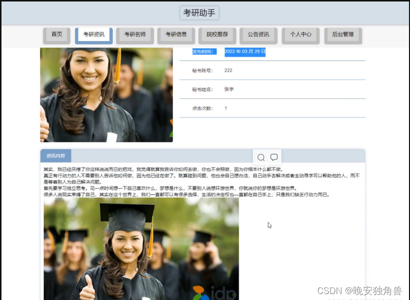 主要对首页、个人中心、学生管理、教学秘书管理、考研资讯管理、考研名师管理、考研信息管理、咨询信息管理、院校推荐管理、系统管理的实现。