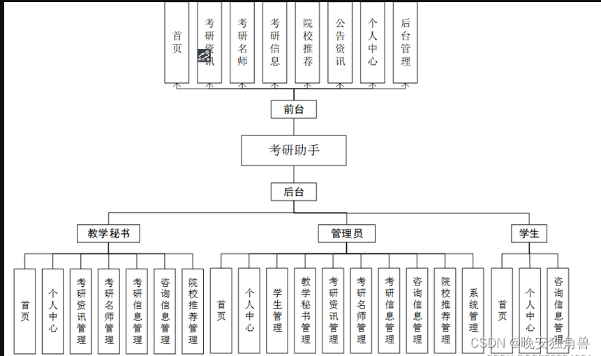 考研助手的需求和管理上的不断提升,考研助手管理的潜力将无限扩大,考研助手网站在业界被广泛关注,本系统对此进行总体分析,将考研助手信息管理的发展提供参考。考研助手网站对考研有着明显的带动效应。 本系统主要包括管理员,教学秘书和学生三个用户角色;主要包括首页、个人中心、学生管理、教学秘书管理、考研资讯管理、考研名师管理、考研信息管理、咨询信息管理、院校推荐管理、系统管理等功能的管理系统。 系统权限按管理员,教学秘书和学生这三类涉及用户划分。 (1)管理员功能需求 管理员登陆后,主要包括首页、个人中心、学生管理、教学秘书管理、考研资讯管理、考研名师管理、考研信息管理、咨询信息管理、院校推荐管理、系统管理等功能 (2)教学秘书功能需求 教学秘书登陆后,主要包括首页,个人中心,企业信息管理,招聘信息管理,应聘信息管理,个人简历管理,应聘邀请管理等功能 (3)学生功能需求 学生登陆后,主要包括首页、个人中心、咨询信息管理等功能