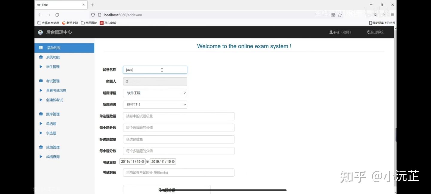 本系统是一个基于java的在线考试系统。它的用户由学生、教师和系统管理员组成。学生登陆系统可以进行在线测试和成绩查询。当学生登陆时,系统会随机地为学生选取试题组成考卷。当学生提交考卷后,系统会自动批改客观题,并将试卷提供给教师查看和提醒教师对试卷主观题进行修改。待教师修改完试卷后,系统会自动生成考生成绩和分数段统计信息。学生可以查询自己的成绩信息和试卷,以便更好地了解自己的学习情况。教师也可以通过分数段统计信息更好地了解学生的学生情况。后台管理员可以对考题,考试设置信息,用户信息进行维护。学生,教师,管理员都可以对个人信息进行维护。